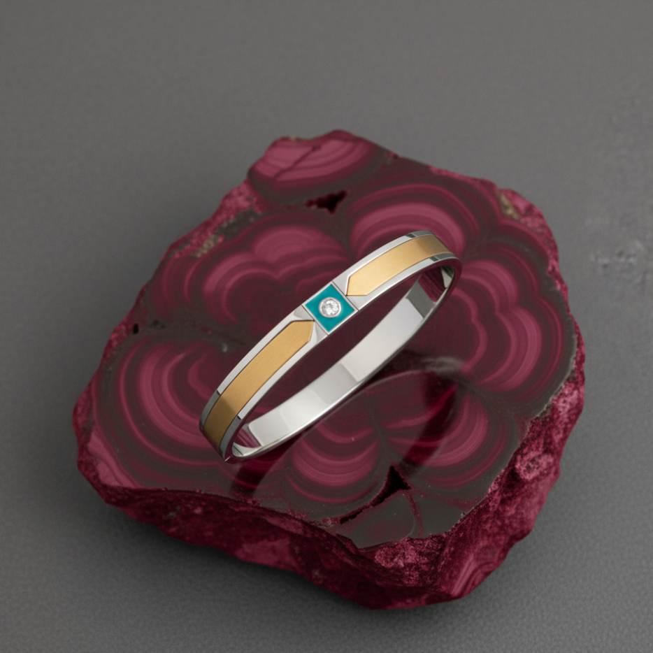 This is an elegant two-tone cuff bracelet featuring a sleek, contemporary design. The bracelet combines a polished silver-toned metal with a central band of warm gold-toned material. A small, brilliant-cut diamond or gemstone is set within a contrasting black or dark accent on the gold band, adding a subtle touch of luxury and refinement. Its open-cuff style makes it easy to slip on and off, perfect for both formal business wear and smart casual outfits.