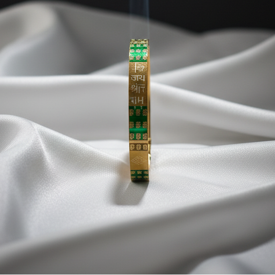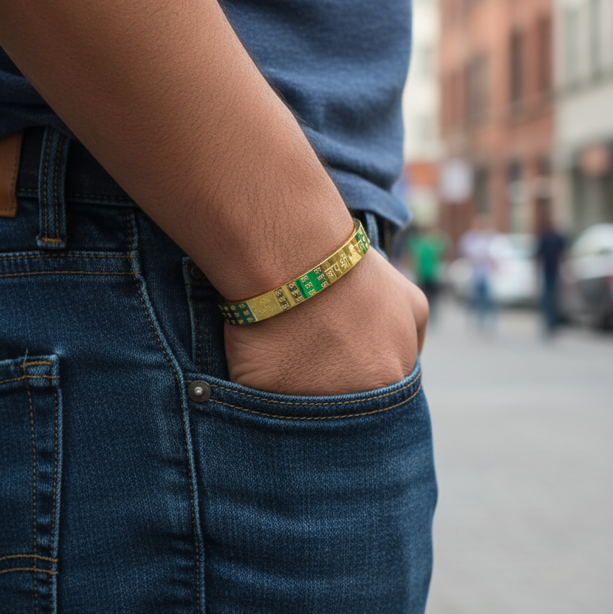 Display your faith with strength and style. This striking Gold-Plated Link Bracelet for men features multiple finely detailed Om symbols, a profound emblem of Hindu spirituality. With a rich, high-shine finish, this durable bracelet is designed to be a powerful and elegant statement piece, perfect for daily wear or as a meaningful gift.