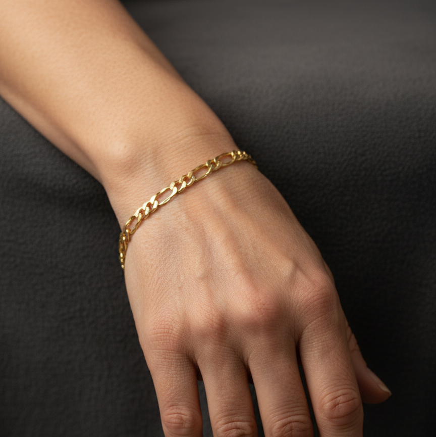 Each link is meticulously 18K gold plated to achieve a rich, luxurious yellow gold colour and a lasting, polished luster. Designed for the modern man, this piece provides the perfect balance of bold presence and comfortable, everyday wear ability. Whether worn solo as a sophisticated signature piece or stacked with other wristwear, the Figaro chain adds a touch of classic luxury to any look.