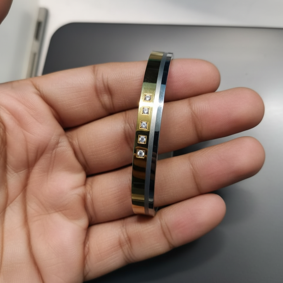 This is a stylish, modern cuff or bangle bracelet featuring a two-tone design (likely gold and silver/steel) with a prominent central strip. This central section is accented with a line of four square-cut stones (likely cubic zirconia or small diamonds) set vertically, giving the piece a refined and contemporary sparkle.